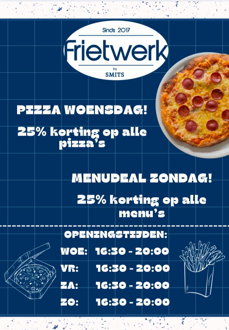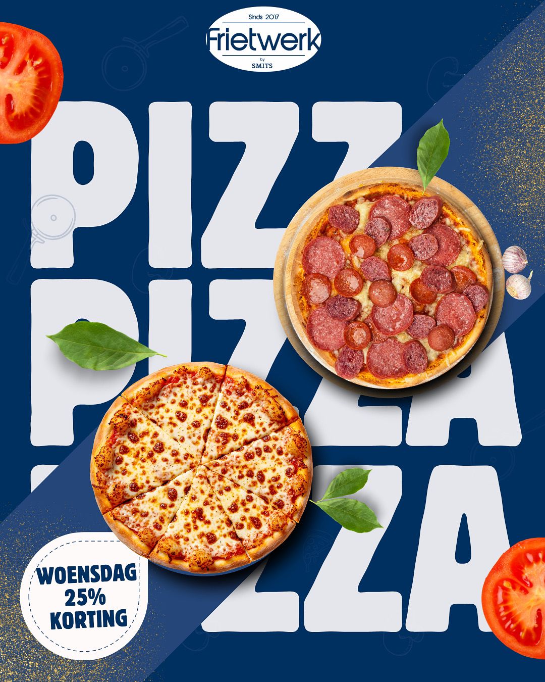 Elke woensdag is het pizzadag bij Frietwerk, kom op woensdag jouw heerlijk verse pizza halen en krijg standaard 25% Korting op elke pizza.
